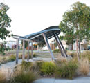 A recycled power pole forms the ‘shaft’ of a striking propeller-inspired structure which provides shade and shelter. The structure overlooks an informal grassed play space, wrapped behind by a low seating wall retaining an extensive planted mound.